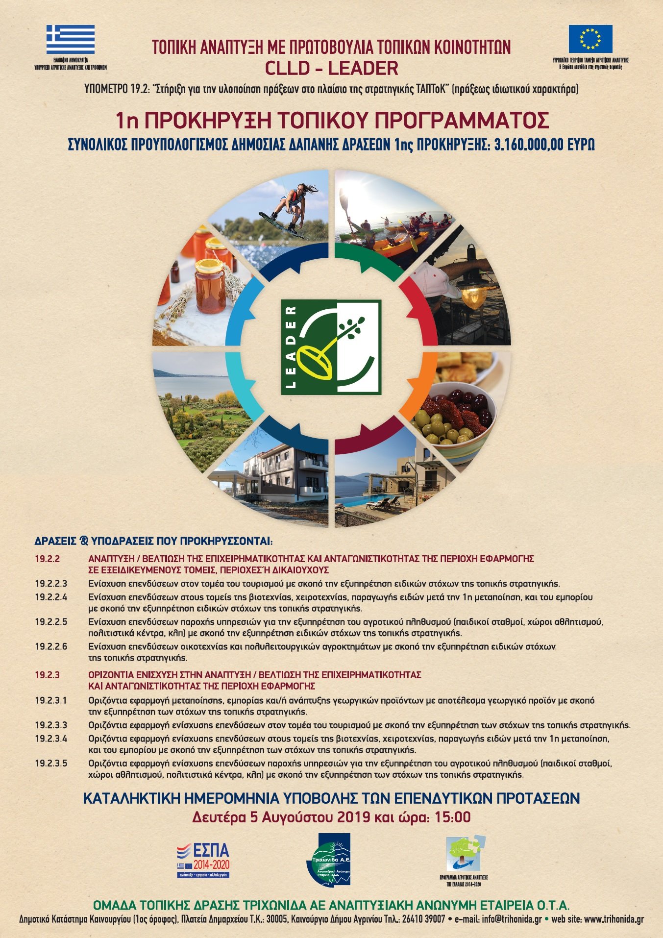 Η ΟΤΔ ΤΡΙΧΩΝΙΔΑ ΑΕ σε συνεργασία με το Δήμο Θέρμου, διοργανώνει Ενημερωτική Συνάντηση στο πλαίσιο της 1ης Πρόσκλησης Εκδήλωσης Ενδιαφέροντος του Μέτρου 19 – Δράση 19.2 (έργα ιδιωτικού χαρακτήρα), του Τοπικού Προγράμματος CLLD-LEADER της ΤΡΙΧΩΝΙΔΑ ΑΕ.