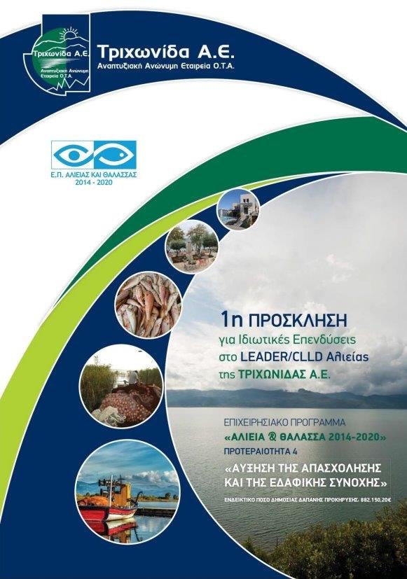 Η ΤΡΙΧΩΝΙΔΑ ΑΕ, Αναπτυξιακή Ανώνυμη Εταιρεία ΟΤΑ – Ενδιάμεσος Φορέας Διαχείρισης – στο πλαίσιο της 1ης Πρόσκλησης Εκδήλωσης Ενδιαφέροντος του Τοπικού Προγράμματος CLLD/LEADER για ιδιωτικά έργα που εντάσσεται στο Ε.Π. «ΑΛΙΕΙΑ & ΘΑΛΑΣΣΑ 2014 -2020» ΠΡΟΤΕΡΑΙΟΤΗΤΑ 4 «ΑΥΞΗΣΗ ΤΗΣ ΑΠΑΣΧΟΛΗΣΗΣ ΚΑΙ ΤΗΣ ΕΔΑΦΙΚΗΣ ΣΥΝΟΧΗΣ» και συγχρηματοδοτείται από το ΕΤΘΑ (LEADER Αλιείας), σας προσκαλεί σε ανοικτή ενημερωτική ημερίδα που διοργανώνει στο Αγρίνιο, στην Συνεδριακή αίθουσα του Επιμελητηρίου, τη Δευτέρα 11 Οκτωβρίου 2021 και ώρα 18:00.