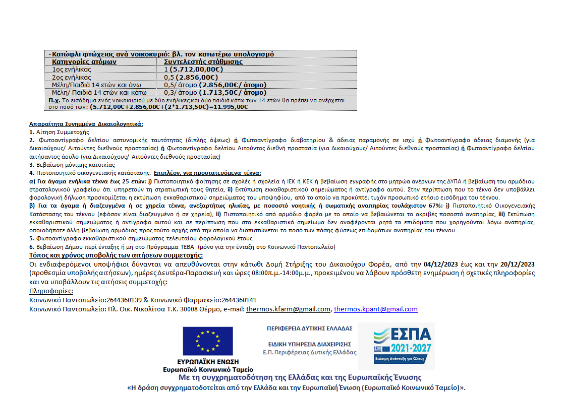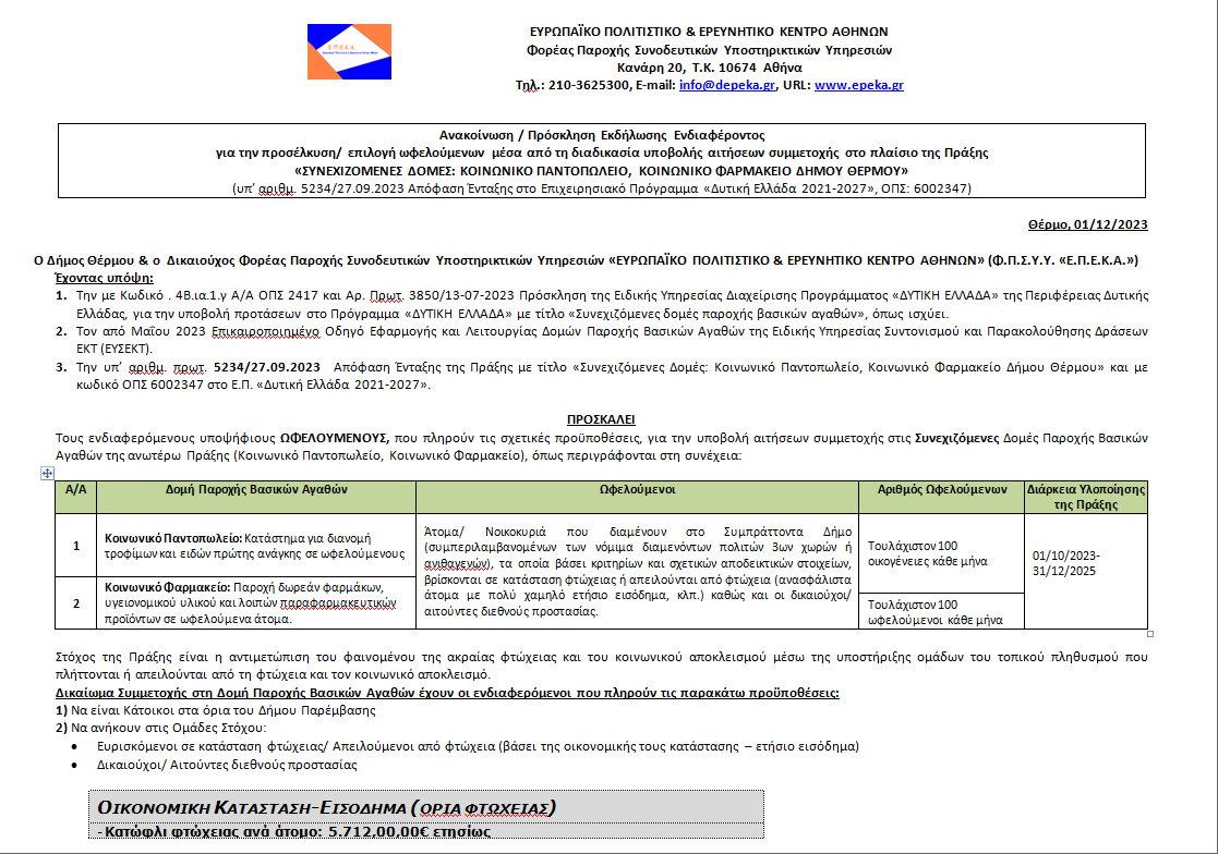 Σας ενημερώνουμε πως από 04/12/2023 έως 20/12/2023 θα υποβάλλονται αιτήσεις συμμετοχής στο Κοινωνικό Παντοπωλείο και Κοινωνικό Φαρμακείο Δήμου Θέρμου, για παλαιούς και νέους ωφελούμενους.